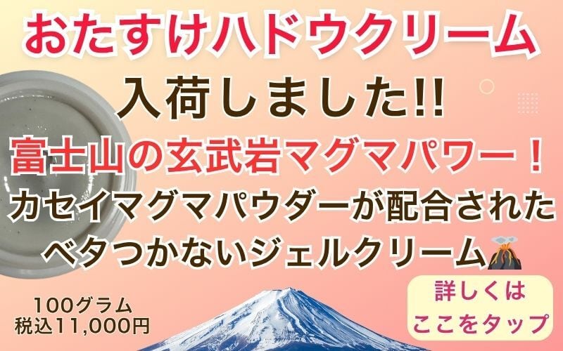 ❤️お顔にも✨からだにも✨今までにない、オールマイティに、ものすっっごいクリーム出ました‼️‼️‼️ ❤️富士山の玄武岩のマグマパワー‼️地球のパワーをカラダに‼️ ❤️ メインの成分「カセイマグマパウダー」が配合された、ベタつかないジェルクリーム✨ ❤️無香料なのに、ほのかに良い香りがします。 ❤️一度は全身塗りしてみてください‼️ ❤️「この成分はスゴイ!」ということで「高くてもいいから!」と、即生産を実現した不思議すぎるクリームです。 ❤️すごく不思議なのですが、まずは『首だけ』にたっぷり塗ってみて。不調のある部分に塗ってみて。「塗る腹巻き」のように、内臓をはさみうちするように、おなかにも横腹にも腰にもグルリと塗ってみて。 ❤️内部の変化、外側(肌)の変化、全身の変化を感じてみてほしいクリームです! ❤️外からなのに、なぜか内側まで…!? ❤️地球のパワーを、首コリ、肩コリに。 コリに気がついてない人に。 腰痛、肌アレルギーに。 きれ痔いぼ痔に。 ペットちゃんに。 【体験談はこちら】 https://inaho4900.com/2026/02/15/おたすけハドウクリーム/ 100g 成分