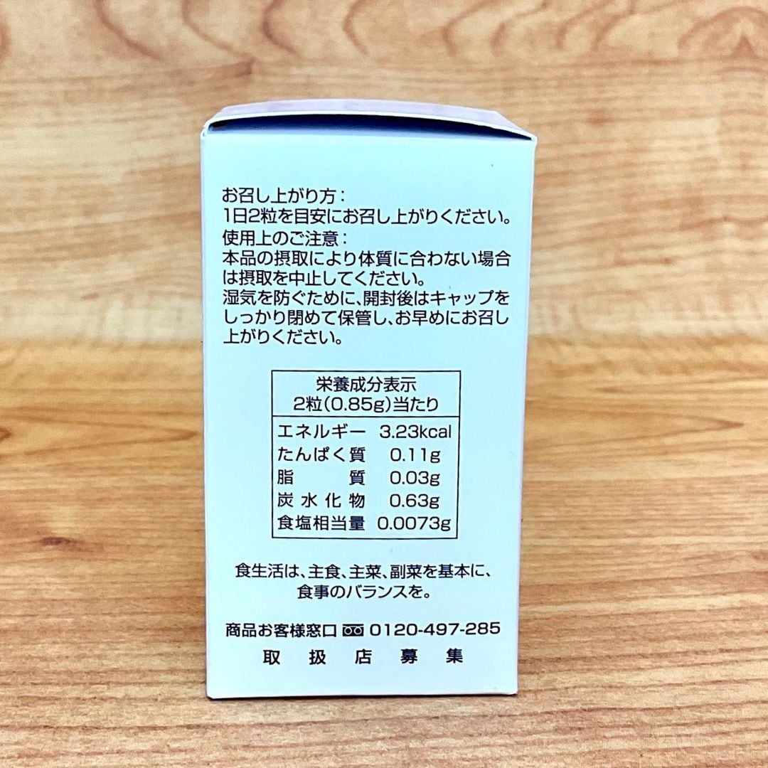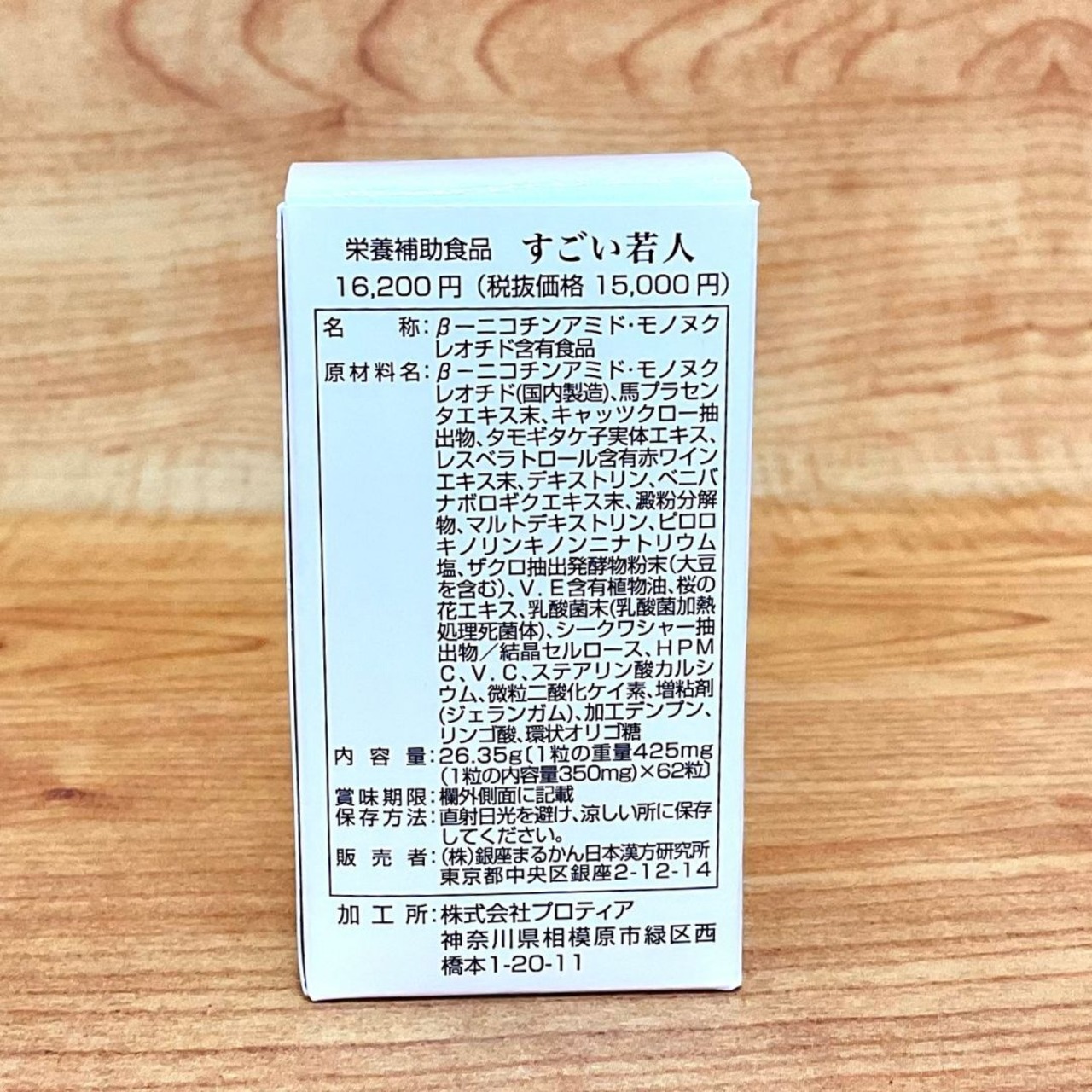 βーニコチンアミド・モノヌクレオチド(国内製造)、馬プラセンタエキス末、キャッツクロー抽出物、タモギタケ子実体エキス末、レスベラトロール含有赤ワインエキス末、デキストリン、ベニバナボロギクエキス末、澱粉分解物、マルトデキストリン、ピロロキノリンキノンニナトリウム塩、ザクロ抽出発酵物粉末(大豆を含む)、V.E含有植物油、桜の花エキス、乳酸菌末(乳酸菌加熱処理死菌体)、シークワシャー抽出物、/結晶セルロース、HPMC、V.C、ステアリン酸カルシウム、微粒二酸化ケイ素、増粘剤(ジェランガム)、加工デンプン、リンゴ酸、環状オリゴ糖