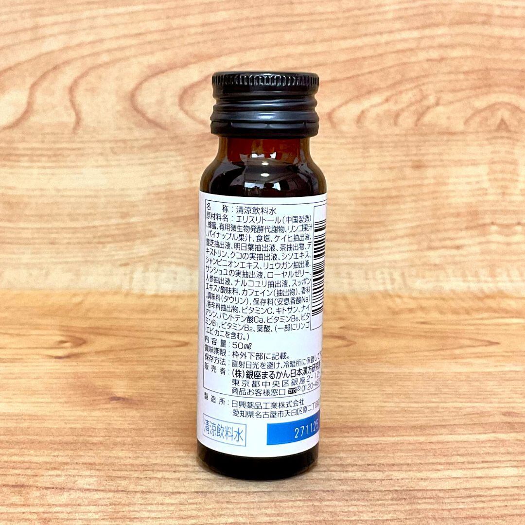 エリスリトール、蜂蜜、有用微生物発酵代謝物、リンゴ果汁、パイナップル果汁、食塩、ケイヒ抽出液、霊芝抽出液、明日葉抽出液、茶抽出物、デキストリン、クコの実抽出液、シソエキス、シャンピニオンエキス、リュウガン抽出液、サンシュユの実抽出液、ローヤルゼリー、人参抽出液、ナルコユリ抽出液、スッポンエキス/酸味料、カフェイン(抽出物)、香料、調味料(タウリン)、保存料(安息香酸Na)、香辛料抽出物、ビタミンC、キトサン、ナイアシン、パントテン酸Ca、ビタミンB6、ビタミンB1、ビタミンB2、葉酸、(一部にリンゴ・エビ・カニを含む。)