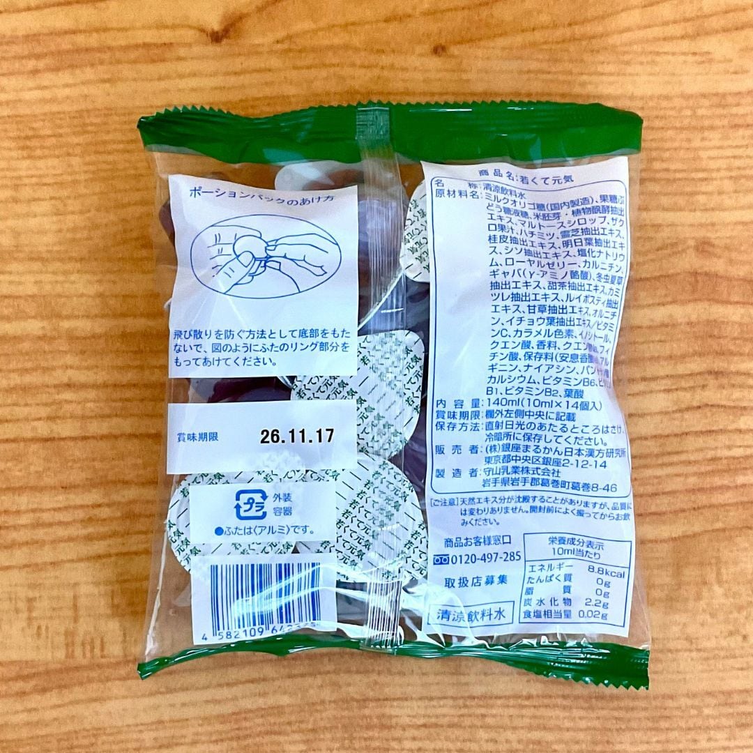 ミルクオリゴ糖(国内製造)、果糖ぶどう糖液糖、米胚芽、植物醗酵抽出エキス、マルトースシロップ、ザクロ果汁、ハチミツ、霊芝抽出エキス、桂皮抽出エキス、明日葉抽出エキス、シソ抽出エキス、塩化ナトリウム、ローヤルゼリー、カルニチン、ギャバ(γ-アミノ酪酸)、冬虫夏草抽出エキス、甜茶抽出エキス、カミツレ抽出エキス、ルイボスティ抽出エキス、甘草抽出エキス、オルニチン、イチョウ葉抽出エキス/ビタミンC、カラメル色素、イノシトール、クエン酸、香料、クエン酸Na、フィチン酸、保存料(安息香酸Na)、アルギニン、ナイアシン、パントテン酸カルシウム、ビタミンB6、ビタミンB1、ビタミンB2、葉酸